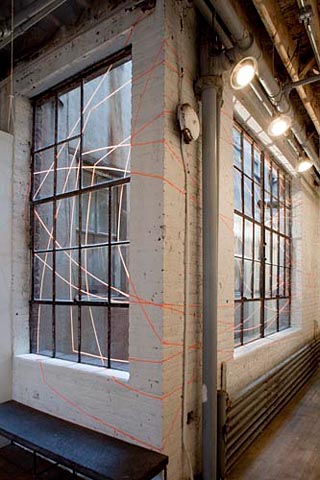 An exhibition of arcing acrylic lines that wrap around the windows and walls.