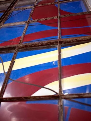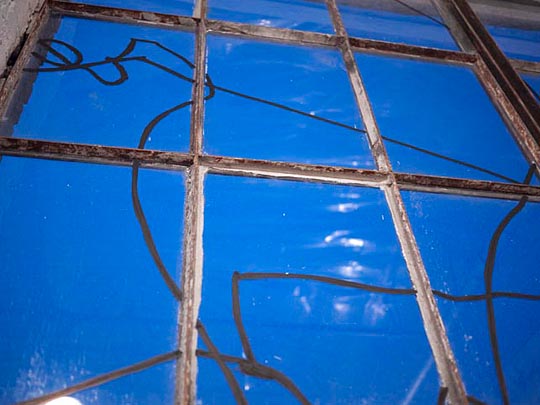 An installation in Brooklyn of acrylic paint on the windows and roll gate.