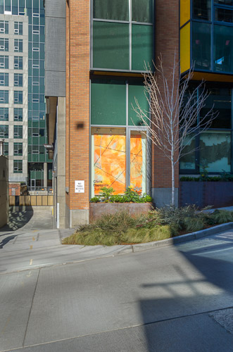 An installation in South Lake Union using acrylic, oriented strand board, fluorescent light, metal studs, wire mesh.