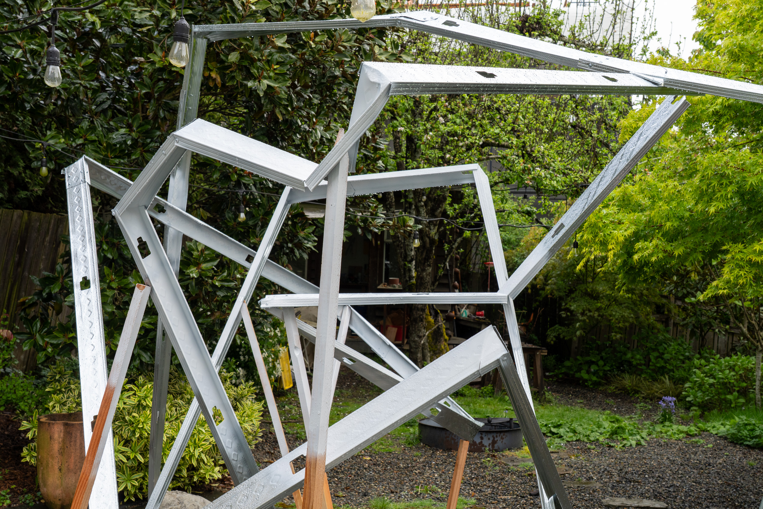 , 2025, steel, wood, concrete, plastic, gravel, spraypaint, bungees, 9 x 8 x 8 feet. Installed in Occidental Park for the 2025 Seattle Walk Don’t Run Art Marathon.