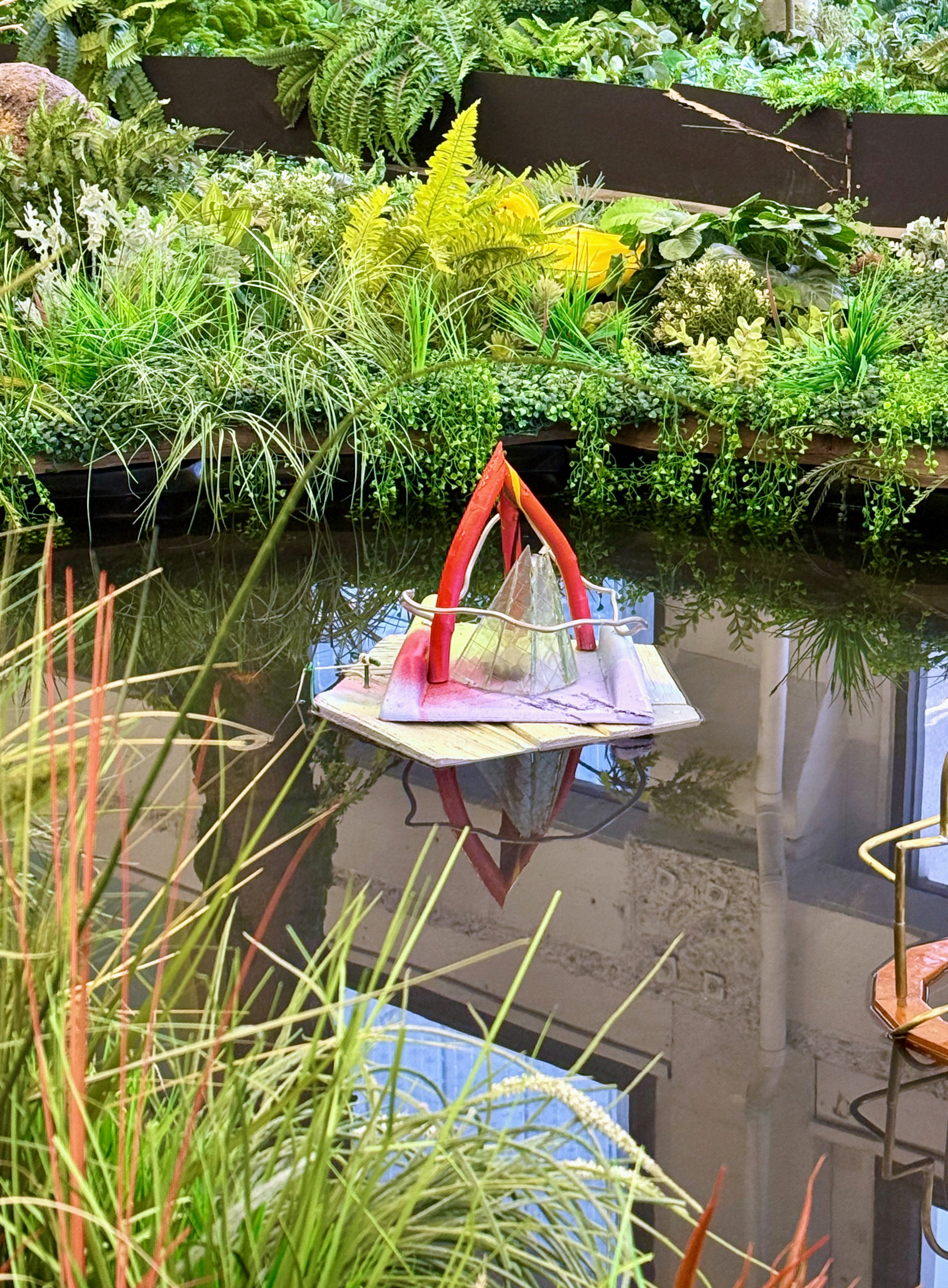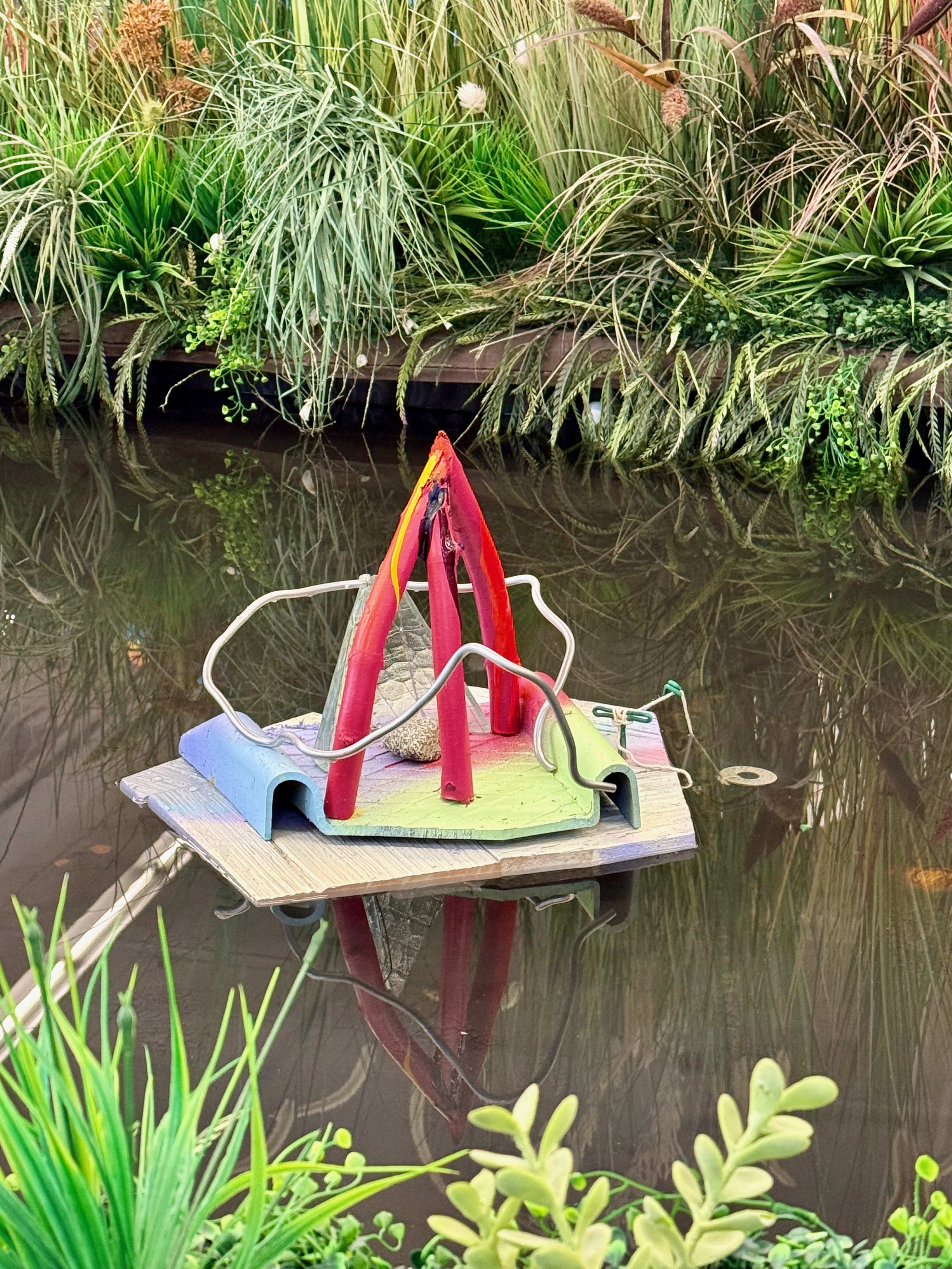 Arch Cone, 2025, wood, metal, wire, stone, acrylic paint, glass, styrofoam, plastic, twine, 12 x 18 x 16 inches. Installed at Cannonball Arts in their Virginia Park Pond January 2026.